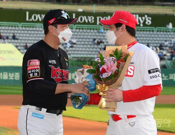 30일 인천 SSG랜더스필드에서 열린 ‘2021 신한은행 SOL KBO리그’에서 SSG 랜더스와 KT 위즈의 경기에서 SSG 최정이 개인 통산 400홈런 기념 KBO 시상식에서 KT 황재균으로부터 축하 꽃다발을 받고 있다.