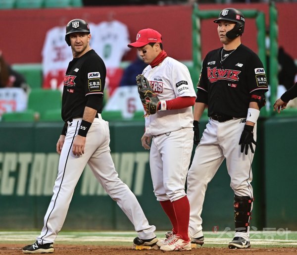 30일 인천 SSG랜더스필드에서 열린 ‘2021 신한은행 SOL KBO리그’에서 SSG 랜더스와 KT 위즈의 경기에서 1회말 1사 만루 KT 장성우가 중견수 희생플라이 쳐낸 뒤 1루주자 호잉과 1루를 밟고 있다.