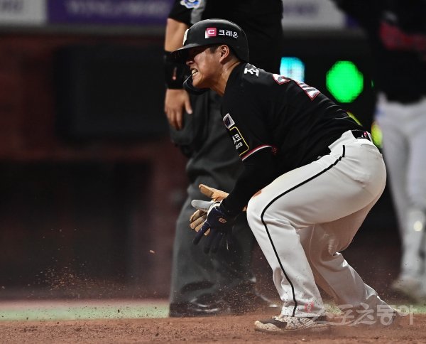 30일 인천 SSG랜더스필드에서 열린 ‘2021 신한은행 SOL KBO리그’에서 SSG 랜더스와 KT 위즈의 경기에서 5회초 1사 1, 3루 SSG의 폭투를 틈타 KT 3루주자 조용호가 홈으로 파고들어 세이프 되고 있다.