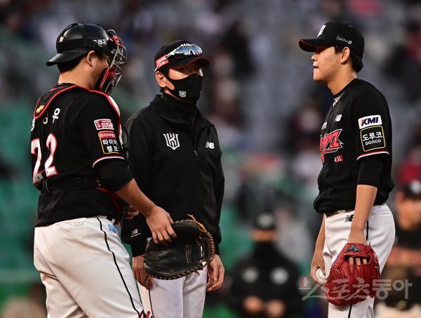 30일 인천 SSG랜더스필드에서 열린 ‘2021 신한은행 SOL KBO리그’에서 SSG 랜더스와 KT 위즈의 경기에서 1회말 무사 만루 상황에서 KT 이강철 감독과 소형준이 이야기를 하고 있다.
