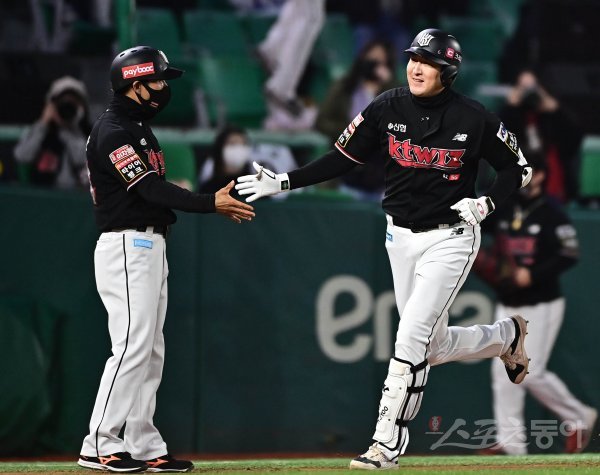 30일 인천 SSG랜더스필드에서 열린 ‘2021 신한은행 SOL KBO리그’에서 SSG 랜더스와 KT 위즈의 경기에서 3회초 2사 KT 유한준이 좌월 솔로 홈런을 쳐낸 뒤 3루코치와 기쁨을 나누고 있다.