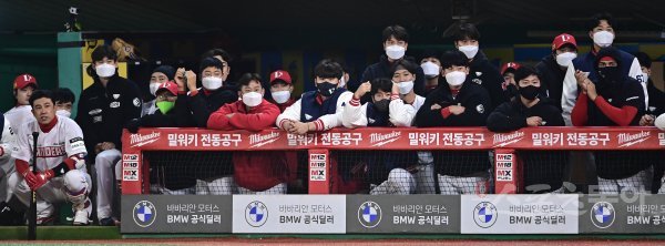 30일 인천 SSG랜더스필드에서 열린 ‘2021 신한은행 SOL KBO리그’에서 SSG 랜더스와 KT 위즈의 경기에서 SSG가 KT에 3-8로 패한 뒤 SSG 선수들이 더그아웃에서 아쉬워하고 있다.