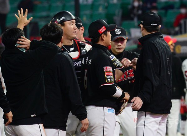 30일 인천 SSG랜더스필드에서 열린 ‘2021 신한은행 SOL KBO리그’에서 SSG 랜더스와 KT 위즈의 경기에서 KT가 SSG에 8-3으로 승리를 거둔 뒤 장성우, 심우준이 동료들과 기쁨을 나누고 있다.
