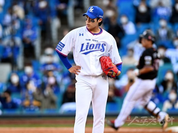 31일 대구 삼성라이온즈파크에서 ‘2021 신한은행 SOL KBO리그’ 삼성 라이온즈와 kt 위즈가 정규리그 1위를 결정짓는 타이브레이커 경기가 열렸다. 6회초 2사 1, 3루에서 실점을 허용한 삼성 선발 원태인이 아쉬워하고 있다.