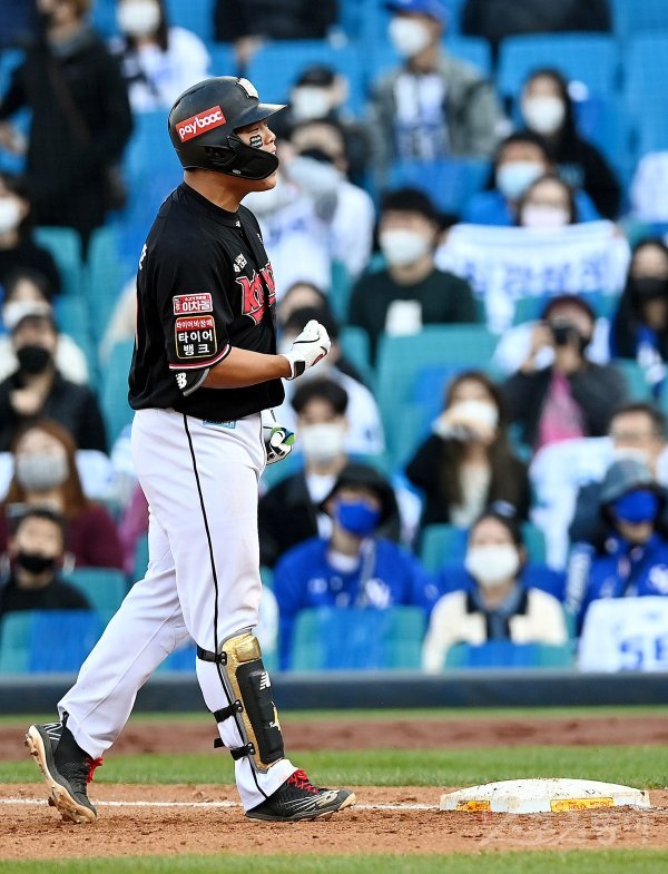 31일 대구 삼성라이온즈파크에서 ‘2021 신한은행 SOL KBO리그’ 삼성 라이온즈와 kt 위즈가 정규리그 1위를 결정짓는 타이브레이커 경기가 열렸다. 6회초 2사 1, 3루에서 kt 강백호가 1타점 적시타를 날린 뒤 포효하고 있다.