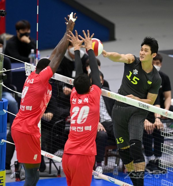 31일 수원체육관에서 열린 ‘2021~2022 도드람 V-리그’ 남자부 한국전력과 현대캐피탈 경기에서 현대캐피탈 문성민이 한국전력의 블로킹 사이로 스파이크를 날리고 있다.