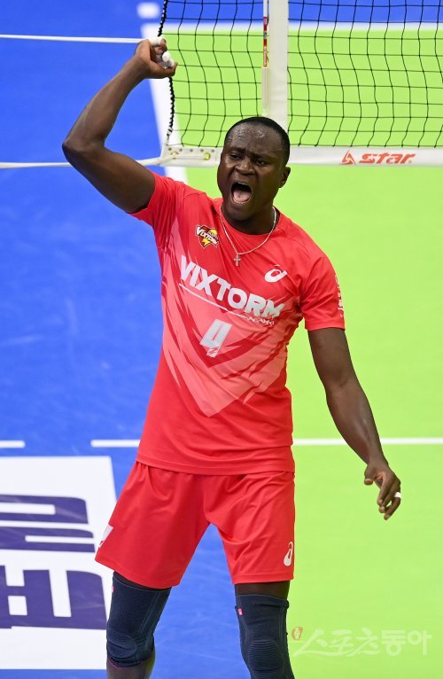 31일 수원체육관에서 열린 ‘2021~2022 도드람 V-리그’ 남자부 한국전력과 현대캐피탈 경기에서 한국전력 다우디가 공격 득점에 성공한 후 기뻐하고 있다.