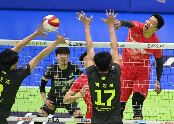 31일 수원체육관에서 열린 ‘2021~2022 도드람 V-리그’ 남자부 한국전력과 현대캐피탈 경기에서 한국전력 신영석이 현대캐피탈의 블로킹 사이로 스파이크를 날리고 있다.