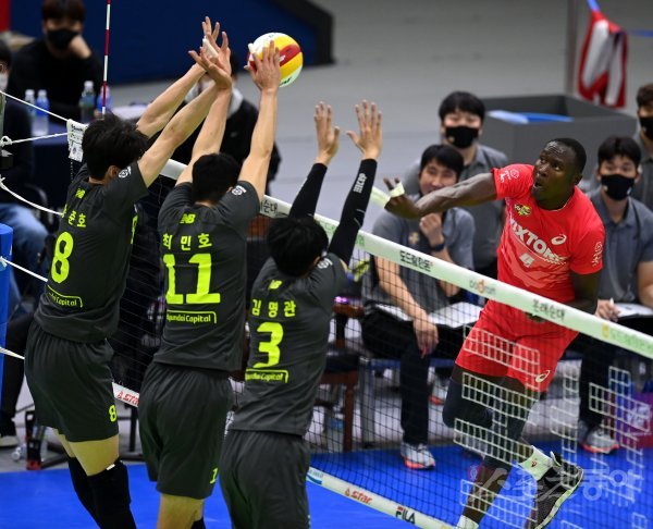 31일 수원체육관에서 열린 ‘2021~2022 도드람 V-리그’ 남자부 한국전력과 현대캐피탈 경기에서 한국전력 다우디가 현대캐피탈의 블로킹 사이로 스파이크를 날리고 있다.