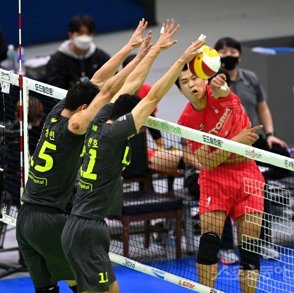 31일 수원체육관에서 열린 ‘2021~2022 도드람 V-리그’ 남자부 한국전력과 현대캐피탈 경기에서 한국전력 서재덕이 현대캐피탈의 블로킹 사이로 스파이크를 날리고 있다.