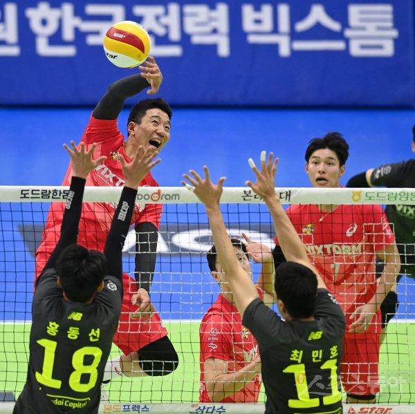 31일 수원체육관에서 열린 ‘2021~2022 도드람 V-리그’ 남자부 한국전력과 현대캐피탈 경기에서 한국전력 신영석이 현대캐피탈의 블로킹 사이로 스파이크를 날리고 있다.