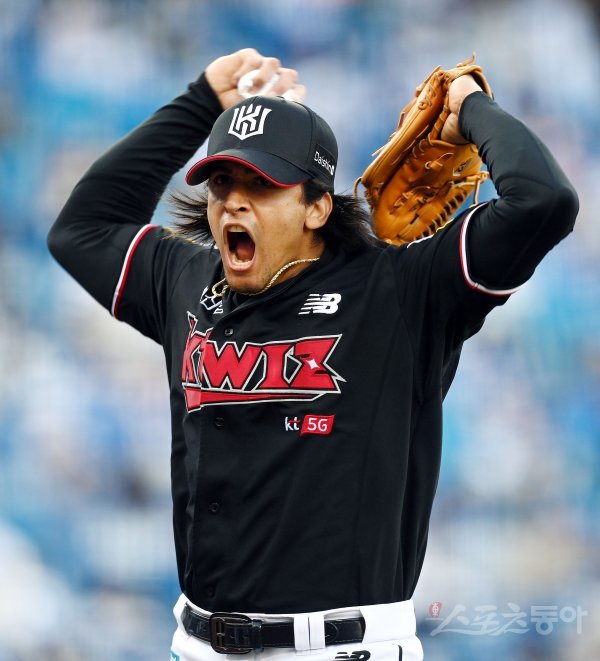 31일 대구 삼성라이온즈파크에서 ‘2021 신한은행 SOL KBO리그’ 삼성 라이온즈와 kt 위즈가 정규리그 1위를 결정짓는 타이브레이커 경기가 열렸다. 7회말 2사 2, 3루에서 kt 선발 쿠에바스가 삼진 아웃을 잡으며 위기를 넘긴 뒤 포효하고 있다.