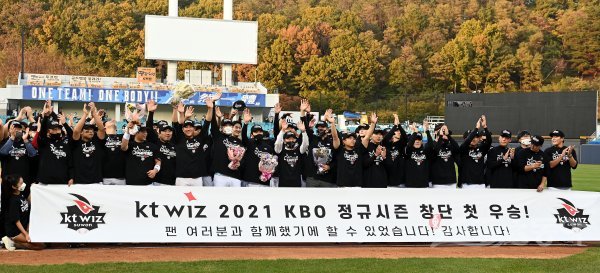 31일 대구 삼성라이온즈파크에서 ‘2021 신한은행 SOL KBO리그’ 삼성 라이온즈와 kt 위즈가 정규리그 1위를 결정짓는 타이브레이커 경기가 열렸다. kt가 삼성을 상대로 1-0으로 승리하며 창단 첫 우승을 차지한 뒤 이강철 감독 및 선수, 코치들이 기념촬영을 하고 있다.