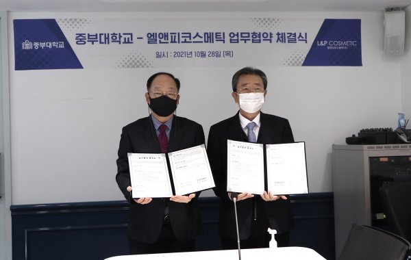 먼저 10월 28일 서울 등촌동 엘앤피코스메틱 본사에서 중부대와 업무 협약을 체결했다. 이번 협약으로 양측은 바이오화장품학 전공자를 중심으로 한 인적 자원 활용 및 연구 개발 등 사회적 가치 실현을 위해 상호 협력을 약속했다. 또 전문 인력 양성과 취업 역량 강화를 위한 교육 및 프로그램 운영 지원, 시설 및 기자재 공동 활용, 장학금 기부 등 양측의 발전과 우호 증진을 위한 사업에 협력할 예정이다.