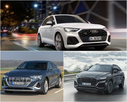 아우디가 Q5 라인업을 확장하고, 고성능 SUV와 전기차 모델을 속속 출시하며 시장 지배력을 강화하고 있다. ‘더 뉴 아우디 SQ5 TFSI’, ‘더 뉴 아우디 RS Q8’, ‘아우디 e-트론 55 스포트백’(위부터 시계방향). 사진제공|아우디코리아