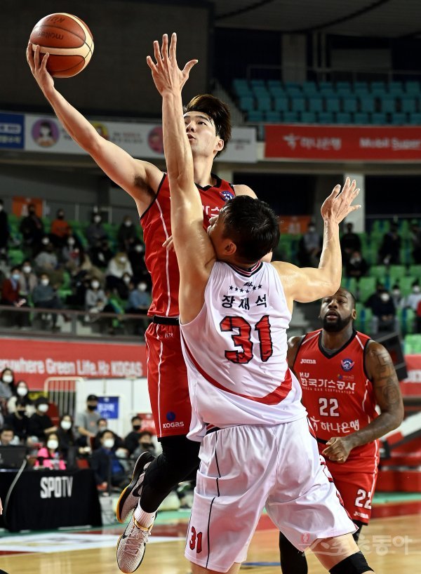 1일 대구실내체육관에서 열린 ‘2021-2022 정관장 프로농구’ 대구 한국가스공사와 울산 현대모비스의 경기에서 한국가스공사 김낙현이 현대모비스 장재석의 수비를 피해 슛을 쏘고 있다.