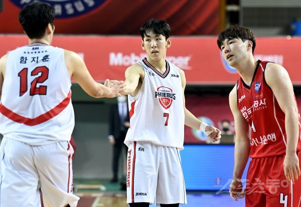 1일 대구실내체육관에서 열린 ‘2021-2022 정관장 프로농구’ 대구 한국가스공사와 울산 현대모비스의 경기에서 현대모비스 서명진이 3점슛을 성공시킨 뒤 함지훈과 기쁨을 나누고 있다.