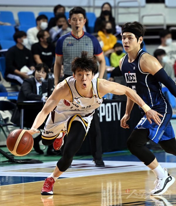 2일 전북 전주실내체육관에서 열린 ‘2021-2022 정관장 프로농구’ 전주 KCC와 창원 LG의 경기에서 LG 이재도가 KCC 유현준의 수비를 제치며 돌파하고 있다.