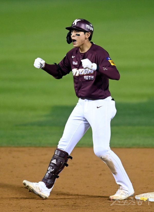 2일 서울 잠실야구장에서 ‘2021 신한은행 SOL KBO리그’ 와일드카드 결정전 2차전 키움 히어로즈와 두산 베어스 경기가 열렸다. 5회초 2사 만루 키움 이정후가 3타점 중전 2루타를 치고 2루에서 기뻐하고 있다.