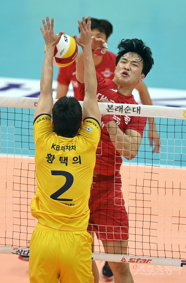 3일 의정부체육관에서 열린 ‘2021~2022 도드람 V-리그’ 남자부 KB손해보험과 대한항공 경기에서 대한항공 임동혁의 스파이크가 KB손해보험 황택의의 블로킹에 걸리고 있다.