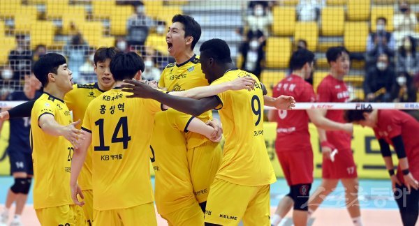 3일 의정부체육관에서 열린 ‘2021~2022 도드람 V-리그’ 남자부 KB손해보험과 대한항공 경기에서 KB손해보험 황택의가 블로킹 득점에 성공한 후 환호하고 있다.