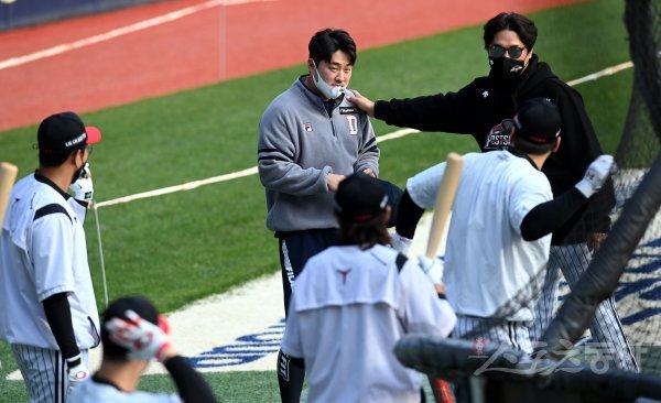 4일 서울 잠실야구장에서 ‘2021 신한은행 SOL KBO리그’ LG 트윈스와 두산 베어스의 준PO 1차전 경기가 열린다. 경기 전 두산 양석환이 훈련중인 LG 임훈 코치 및 선수들과 만나 이야기를 나누고 있다.