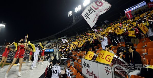 4일 서울 잠실야구장에서 ‘2021 신한은행 SOL KBO리그’ LG 트윈스와 두산 베어스의 준PO 1차전 경기가 열렸다. LG 야구팬들이 응원을 펼치고 있다.