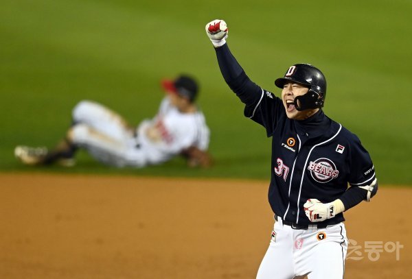 4일 서울 잠실야구장에서 ‘2021 신한은행 SOL KBO리그’ 준플레이오프 1차전 두산 베어스와 LG 트윈스 경기가 열렸다. 5회초 2사 3루 두산 박건우가 1타점 적시타를 치고 1루에서 환호하고 있다.