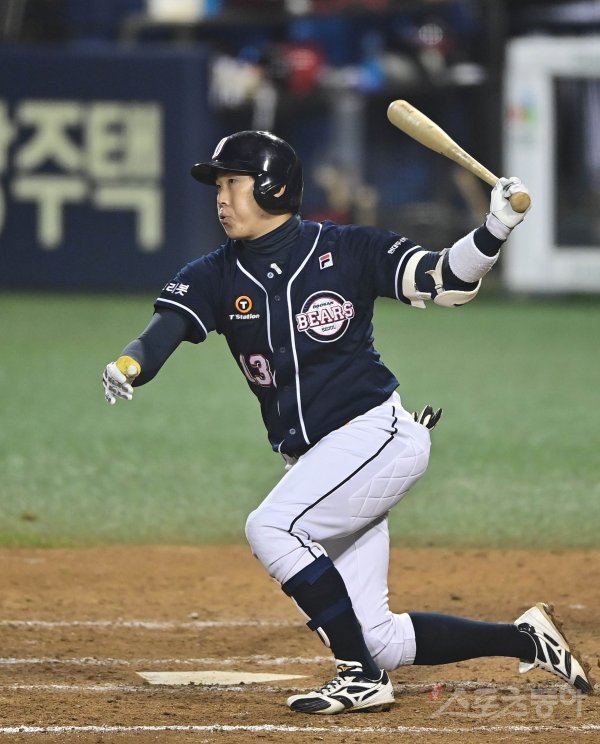4일 서울 잠실야구장에서 열린 ‘2021 신한은행 SOL KBO리그’ 포스트시즌 준 플레이오프 1차전 LG 트윈스와 두산 베어스의 경기에서 8회초 무사 두산 허경민이 좌전 2루타를 치고 있다.