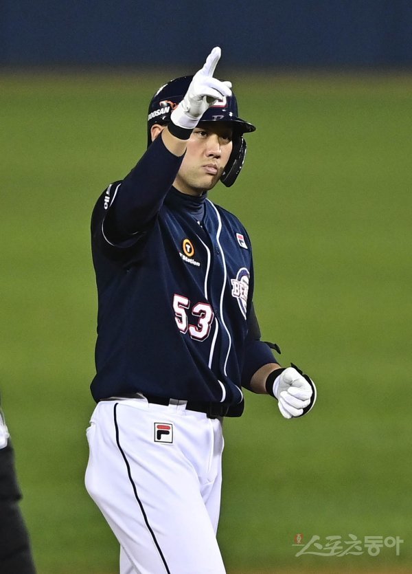4일 서울 잠실야구장에서 열린 ‘2021 신한은행 SOL KBO리그’ 포스트시즌 준 플레이오프 1차전 LG 트윈스와 두산 베어스의 경기에서 9회초 2사 두산 양석환이 중전 2루타를 쳐낸 뒤 세리머니를 하고 있다.
