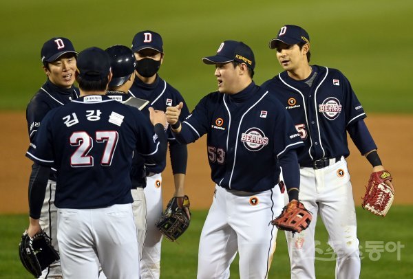 4일 서울 잠실야구장에서 ‘2021 신한은행 SOL KBO리그’ 준플레이오프 1차전 두산 베어스와 LG 트윈스 경기가 열렸다. 5-1 승리를 거둔 후 두산 선수들이 하이파이브 하고 있다.