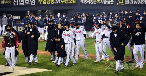 4일 서울 잠실야구장에서 ‘2021 신한은행 SOL KBO리그’ LG 트윈스와 두산 베어스의 준PO 1차전 경기가 열렸다. 두산에 1-5로 패한 LG 선수들이 그라운드를 빠져나가고 있다.