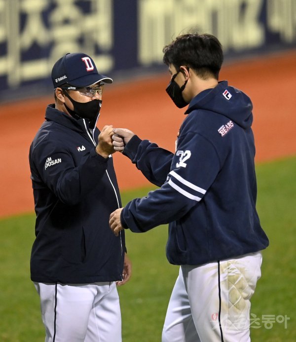4일 서울 잠실야구장에서 ‘2021 신한은행 SOL KBO리그‘ 준플레이오프 1차전 두산 베어스와 LG 트윈스 경기가 열렸다. 5-1 승리를 거둔 후 두산 김태형 감독 하이파이브 하고 있다. 잠실 | 김종원 기자 won@donga.com