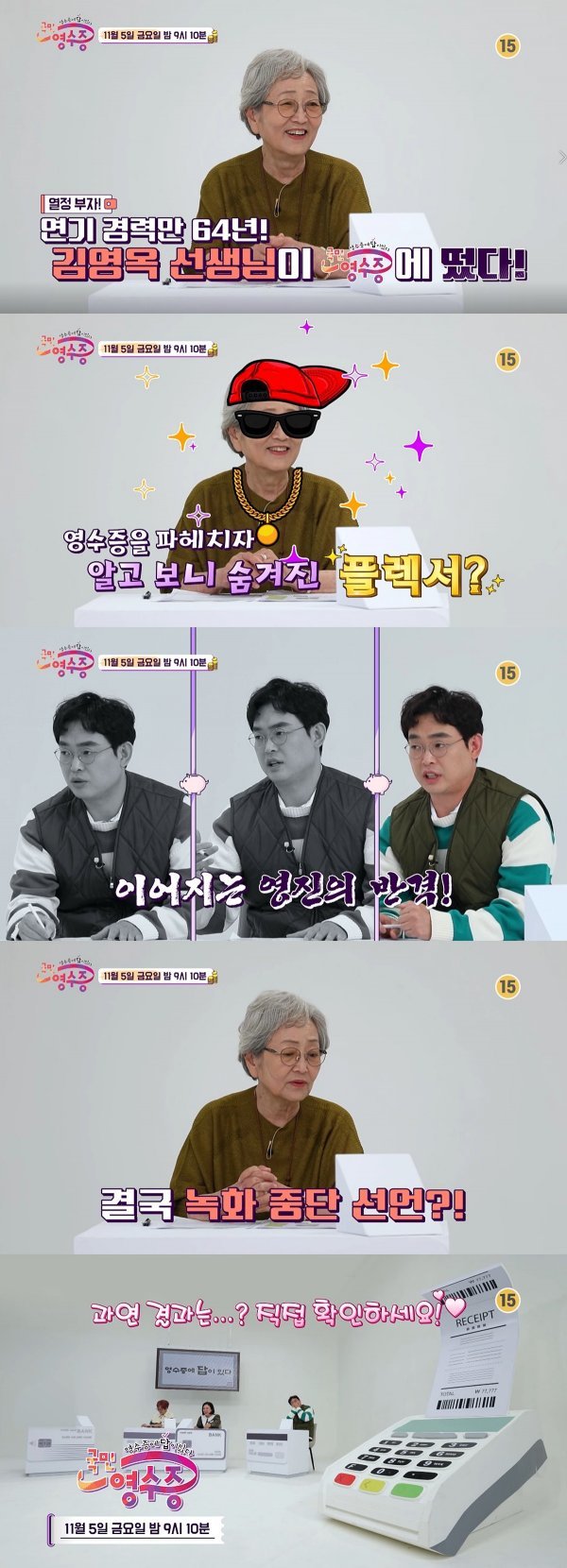 이후 공개된 김영옥 영수증에는 함께 촬영한 스태프들의 식사비 결제 내역이 가득해 시선을 끈다. 이에 박영진이 '깔깔이 조언'을 건네지만, 김영옥은 "나 하다가 나간다"라고 선언해 '국민 참견러' 박영진을 당황하게 한다.
