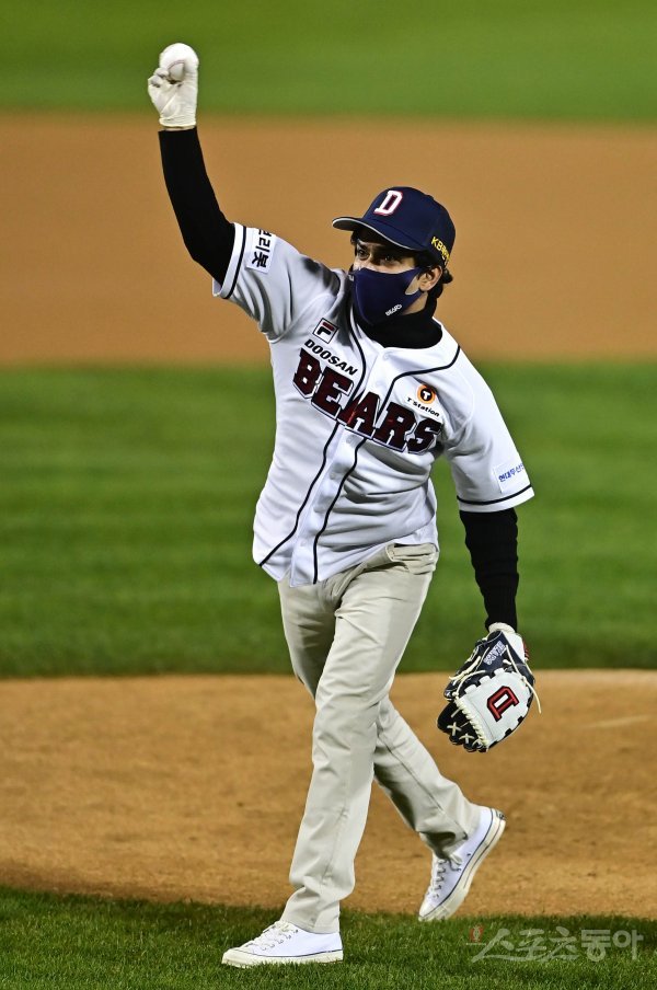 5일 서울 잠실야구장에서 열린 ‘2021 신한은행 SOL KBO리그’ 포스트시즌 준 플레이오프 1차전 LG 트윈스와 두산 베어스의 경기에서 배우 아누팜이 승리 기원 시구를 하고 있다.