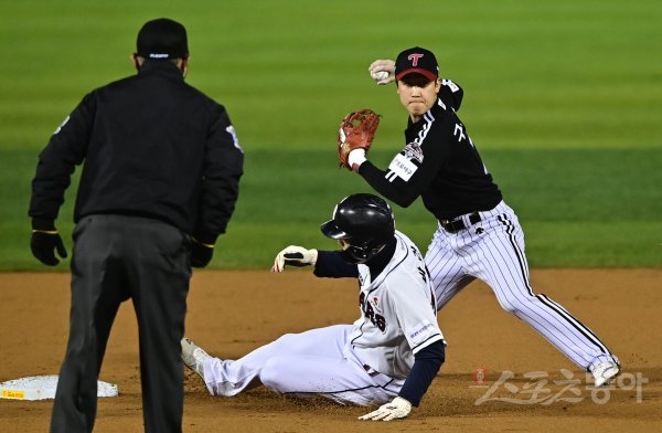 5일 서울 잠실야구장에서 열린 ‘2021 신한은행 SOL KBO리그’ 포스트시즌 준 플레이오프 1차전 LG 트윈스와 두산 베어스의 경기에서 1회말 1사 1, 2루 두산의 내야 땅볼 때 LG 유격수 구본혁이 1루주자를 포스 아웃시킨 뒤 1루로 송구하고 있다.