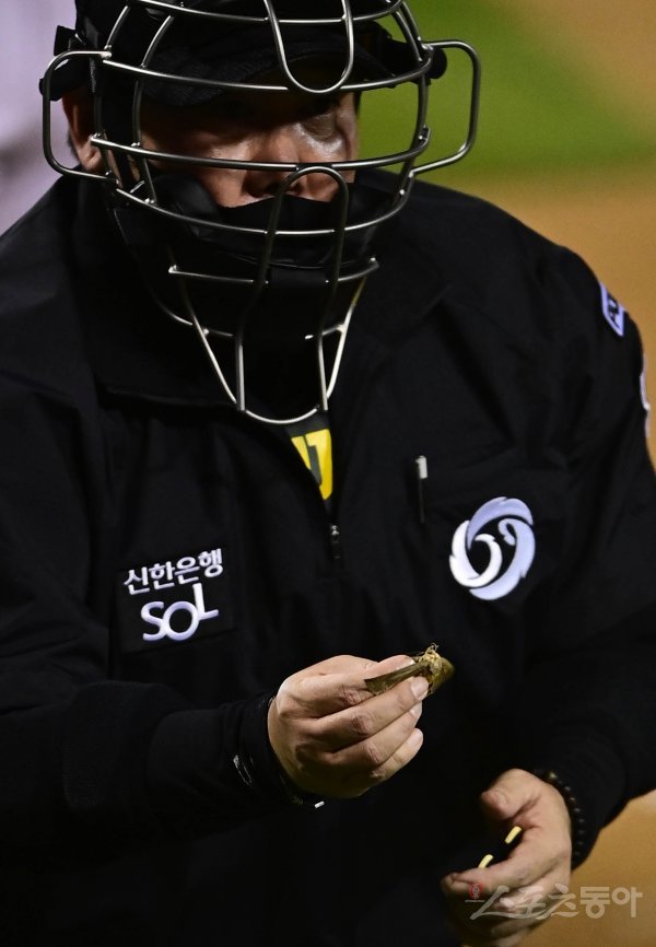 5일 서울 잠실야구장에서 열린 ‘2021 신한은행 SOL KBO리그’ 포스트시즌 준 플레이오프 1차전 LG 트윈스와 두산 베어스의 경기에서 4회말 심판이 나방을 잡아 배트보이에게 전달하고 있다.
