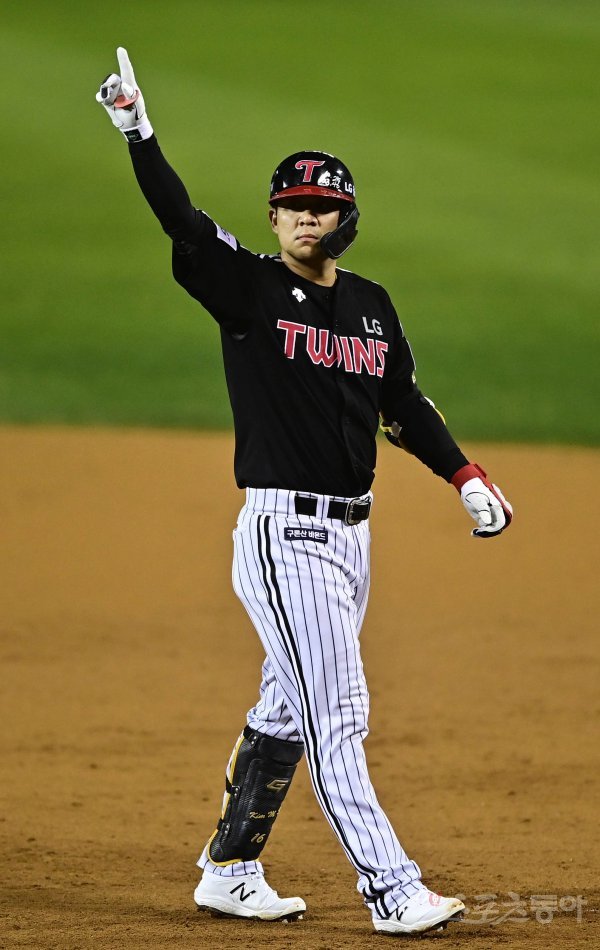 5일 서울 잠실야구장에서 열린 ‘2021 신한은행 SOL KBO리그’ 포스트시즌 준 플레이오프 1차전 LG 트윈스와 두산 베어스의 경기에서 4회초 2사 1, 2루 LG 김민성이 1타점 좌전 적시타를 쳐낸 뒤 세리머니를 하고 있다.