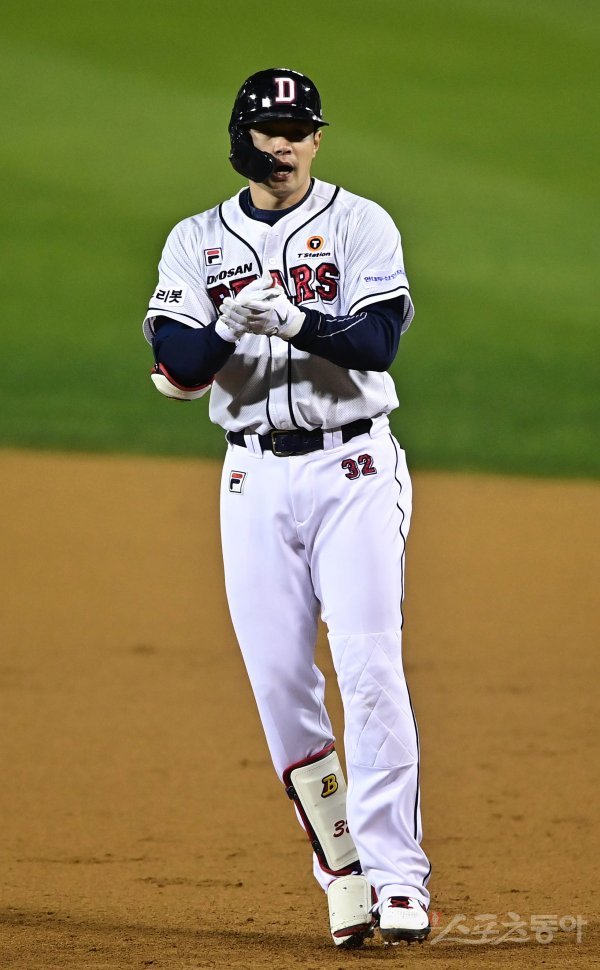 5일 서울 잠실야구장에서 열린 ‘2021 신한은행 SOL KBO리그’ 포스트시즌 준 플레이오프 1차전 LG 트윈스와 두산 베어스의 경기에서 6회말 무사 2루 두산 김재환이 1타점 중전 적시타를 쳐낸 뒤 세리머니를 하고 있다.