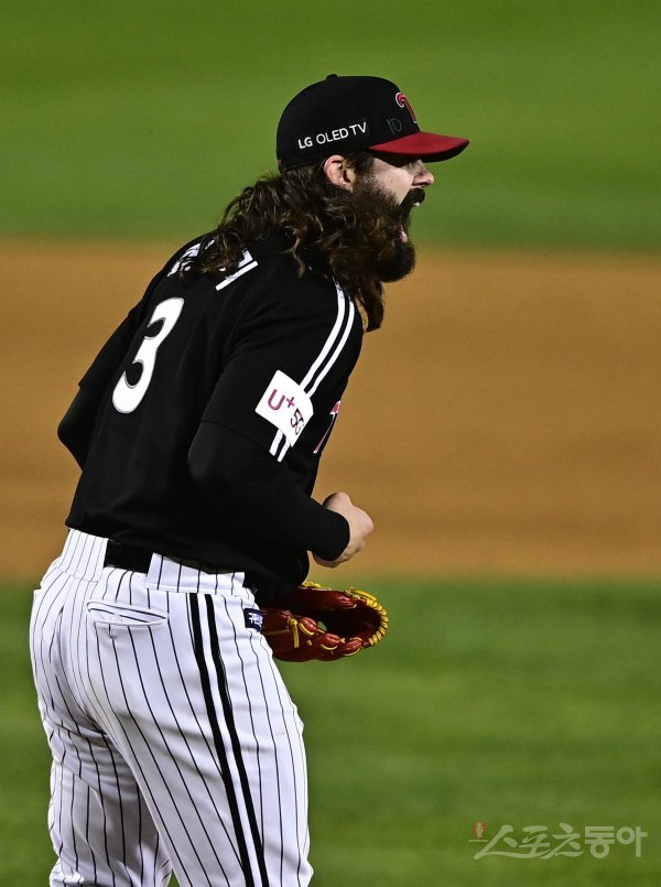 5일 서울 잠실야구장에서 열린 ‘2021 신한은행 SOL KBO리그’ 포스트시즌 준 플레이오프 1차전 LG 트윈스와 두산 베어스의 경기에서 5회말 2사 1, 2루 두산을 삼진으로 막은 LG 켈리가 포효하고 있다.