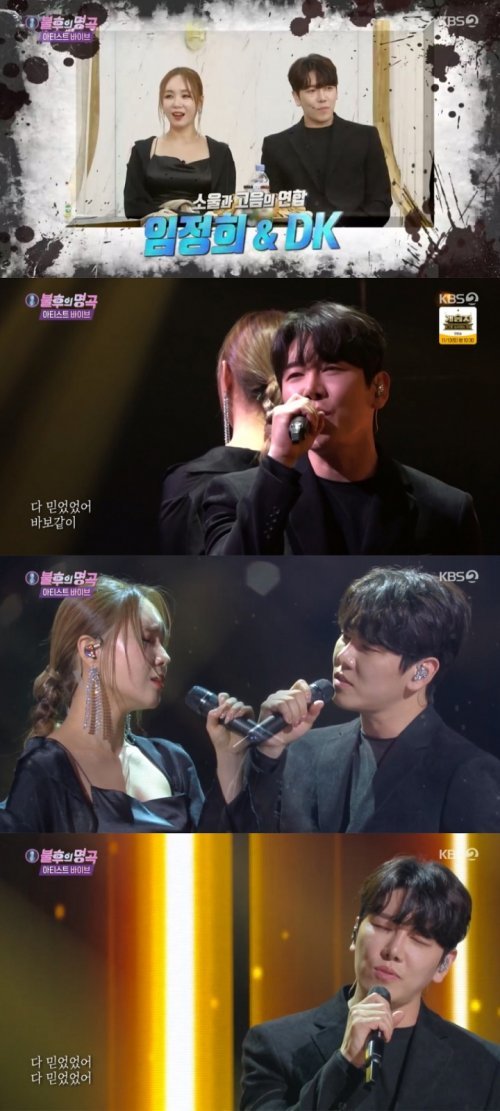 네 번째 순서로 무대에 오른 DK는 미니홈피 BGM으로 발매 당시 큰 사랑을 받았던 바이브의 ‘그 남자 그 여자’로 임정희와 듀엣 무대를 펼쳤다. 특히 DK는 섬세한 표현력으로 곡에 담긴 애절한 이별 감성을 생생하게 전달했으며, 후반부 폭발적인 고음과 함께 임정희와 완벽한 화음으로 레전드 듀엣 무대를 탄생시켰다.