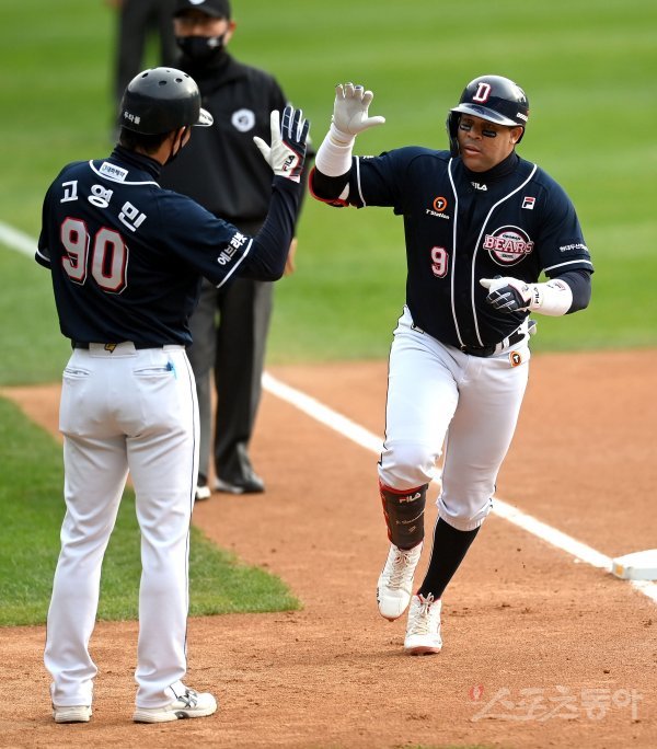 7일 서울 잠실야구장에서 ‘2021 신한은행 SOL KBO리그’ 준플레이오프 3차전 두산 베어스와 LG 트윈스 경기가 열렸다. 3회초 1사 2루 두산 페르난데스가 우월 투런 홈런을 날리고 그라운드를 돌며 하이파이브 하고 있다.