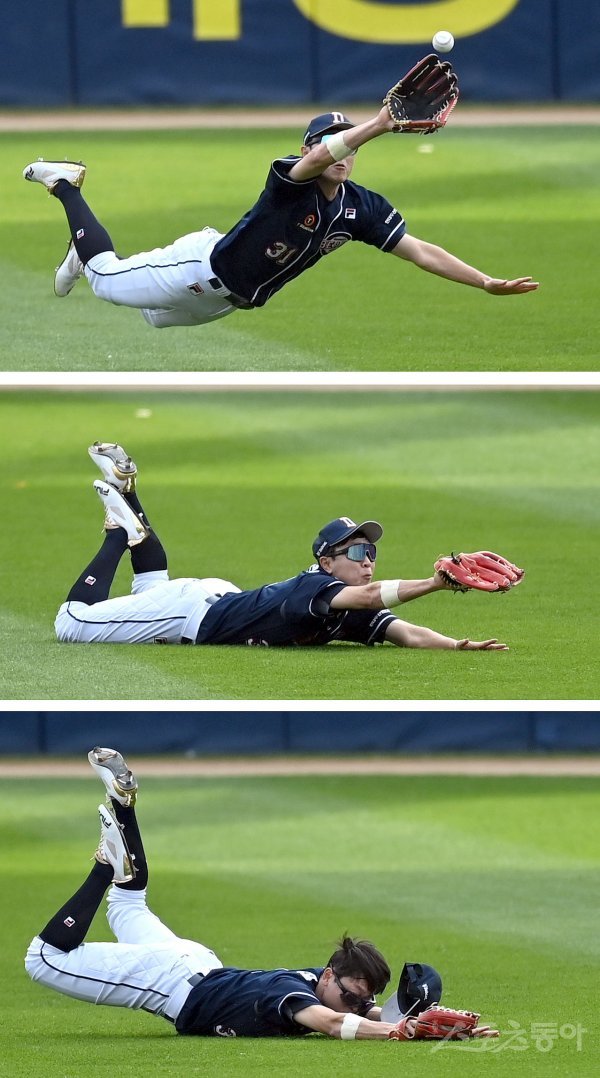 7일 서울 잠실야구장에서 ‘2021 신한은행 SOL KBO리그’ 준플레이오프 3차전 두산 베어스와 LG 트윈스 경기가 열렸다. 2회말 1사 두산 정수빈이 외야 뜬공을 다이빙캐치로 잡고 있다.