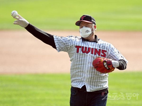 7일 서울 잠실야구장에서 ‘2021 신한은행 SOL KBO리그’ 준플레이오프 3차전 두산 베어스와 LG 트윈스 경기가 열렸다. 경기 전 LG 투수 켈리의 아버지 팻 켈리 감독이 시구를 하고 있다.