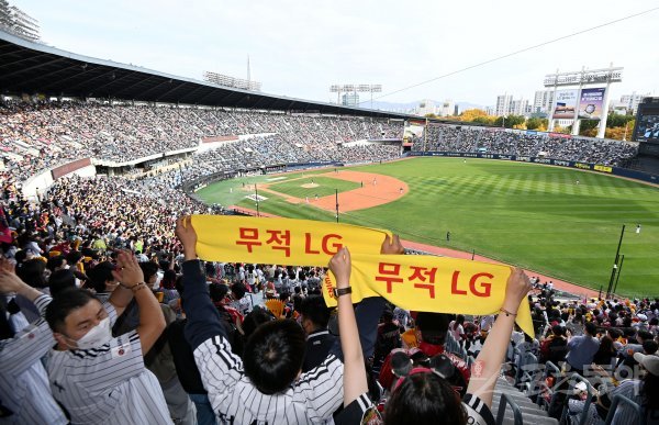 7일 서울 잠실야구장에서 ‘2021 신한은행 SOL KBO리그’ LG 트윈스와 두산 베어스의 준PO 3차전 경기가 열렸다. LG 야구팬들이 관중석을 가득 메우며 응원을 펼치고 있다.