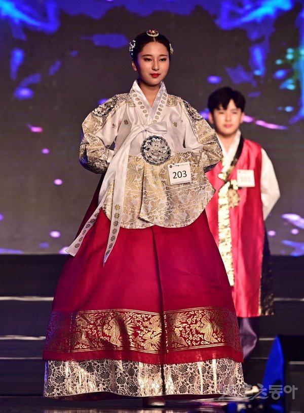 7일 서울 광진구 광장동 비스타워커힐 서울에서 열린 ‘2021 세종대왕 소헌왕후’ 선발대회에서 나르샤 부문 여자 203번 석진이 워킹 퍼포먼스를 하고 있다. ‘세종대왕 소헌왕후 선발대회’는 우리 역사상 가장 위대한 성군인 세종대왕을 널리 알리고 업적을 계승, 발전시키기 위해 개최한 대회이다. 본 대회 수상자들은 대한민국 홍보대사로서 활동하게 되며, 한글의 우수성과 한복의 아름다움, 한식의 세계화 및 한류 문화를 전세계에 알리는 한복 모델로 활동하게 된다.