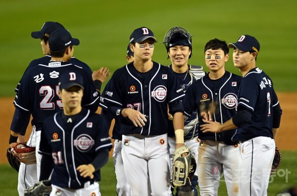 7일 서울 잠실야구장에서 ‘2021 신한은행 SOL KBO리그’ 준플레이오프 3차전 두산 베어스와 LG 트윈스 경기가 열렸다. 10-2 승ㄹ를 거두며 플레이오프 진출을 확정지은 두산 선수들이 하이파이브 하고 있다.