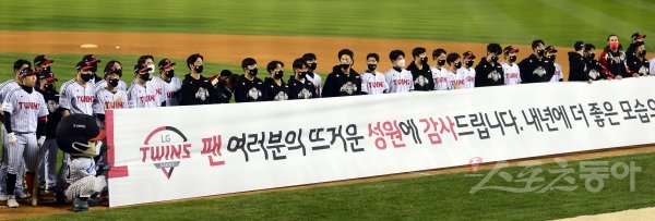 7일 서울 잠실야구장에서 ‘2021 신한은행 SOL KBO리그’ 준플레이오프 3차전 두산 베어스와 LG 트윈스 경기가 열렸다. LG가 2-10으로 패하며 플레이오프 진출이 좌절됐다. LG 선수들이 팬들에게 인사하고 있다.