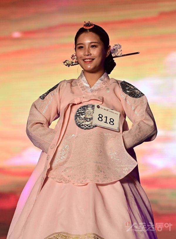 7일 서울 광진구 광장동 비스타워커힐 서울에서 열린 ‘2021 세종대왕 소헌왕후’ 선발대회에서 소헌왕후 부문 818번 엄진영이 워킹 퍼포먼스를 하고 있다. ‘세종대왕 소헌왕후 선발대회’는 우리 역사상 가장 위대한 성군인 세종대왕을 널리 알리고 업적을 계승, 발전시키기 위해 개최한 대회이다. 본 대회 수상자들은 대한민국 홍보대사로서 활동하게 되며, 한글의 우수성과 한복의 아름다움, 한식의 세계화 및 한류 문화를 전세계에 알리는 한복 모델로 활동하게 된다.