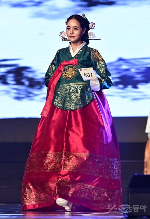 7일 서울 광진구 광장동 비스타워커힐 서울에서 열린 ‘2021 세종대왕 소헌왕후’ 선발대회에서 모도리 부문 여자 402번 김민서가 워킹 퍼포먼스를 하고 있다. ‘세종대왕 소헌왕후 선발대회’는 우리 역사상 가장 위대한 성군인 세종대왕을 널리 알리고 업적을 계승, 발전시키기 위해 개최한 대회이다. 본 대회 수상자들은 대한민국 홍보대사로서 활동하게 되며, 한글의 우수성과 한복의 아름다움, 한식의 세계화 및 한류 문화를 전세계에 알리는 한복 모델로 활동하게 된다.